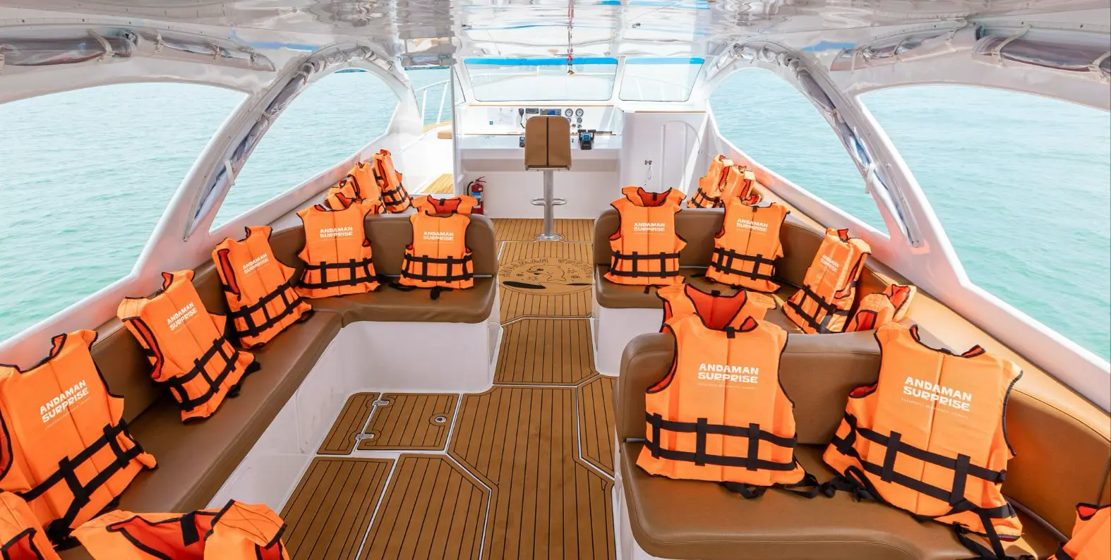 As we continue to innovate and enhance our fleet, Andaman Surprise offers a selection of well-maintained, modern boats designed for safety, comfort, and unforgettable experiences. Step aboard our premium speedboats, where comfort meets style. Featuring spacious lounge seating, our boats offer a private and relaxed atmosphere for an unparalleled journey. With plenty of room to unwind, every moment on board is crafted for your enjoyment and ease.